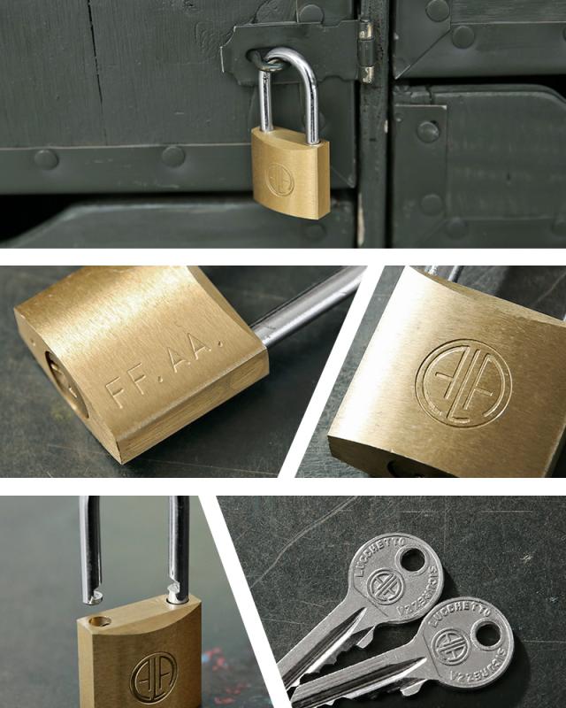 実物 新品 デッドストック イタリア軍 METAL PADLOCK(メタル パドロック)南京錠のご紹介です。イタリア語でイタリア軍を意味するForze armateの略称FF.AA.が片面に刻印され、反対側にもロゴマークが刻印されたイタリア軍放出の南京錠が入荷しました。金属製の本体と鍵はスペアと合わせて2本が付属しています。鍵の細部にまで雰囲気のあるデザインが施されていますので実用にもコレクションにもお勧めな希少価値のあるアイテムです。