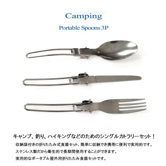 セット内容:折りたたみ式テーブルナイフ×1、折りたたみ式フォーク×1、折りたたみスプーン×1、収納袋×1