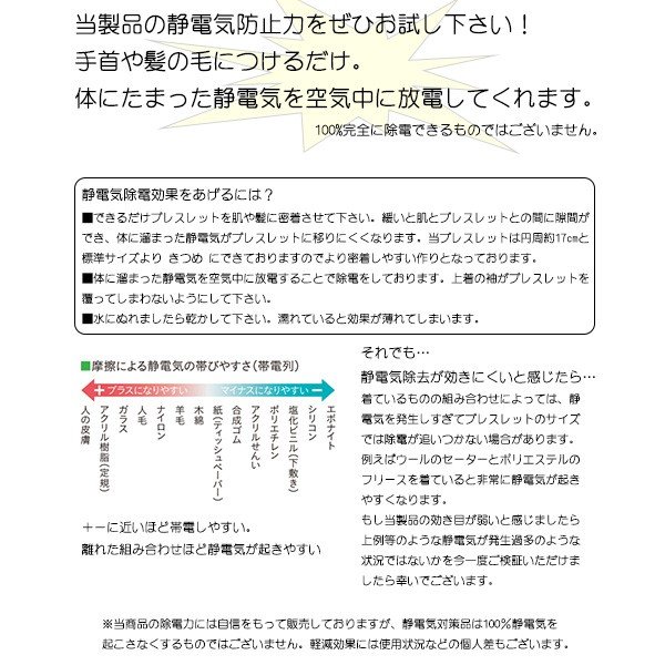 当ブレスレットの素材には高い静電気除去能力のある導電性繊維が含まれていて、肌と繊維が触れた箇所から体内の静電気を除電します。