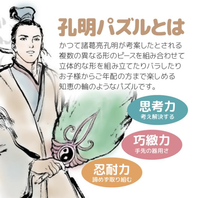 孔明鎖(孔明パズル)は、三国時代に諸葛亮孔明が得意の八卦を用いて発明した玩具と言われています。一説によると孔明はこれを用いて戦局を占ったとか。