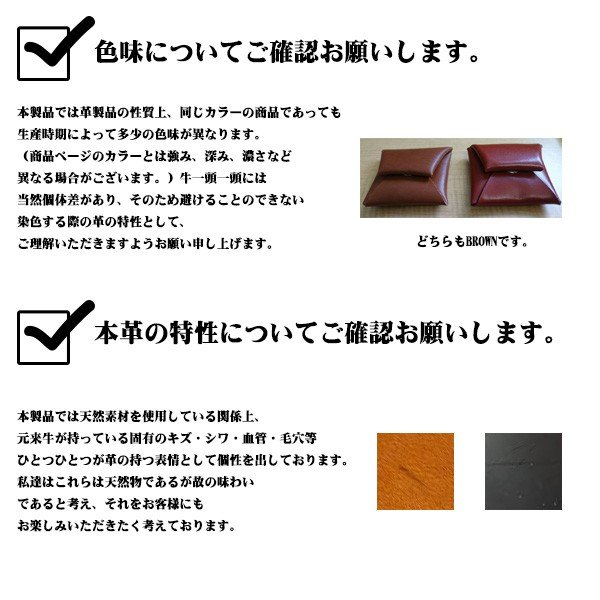 ・天然素材を活かした仕上げを行なっているため、シワやキズなどがある場合がございます。(牛のキズや血管、毛穴の痕など)