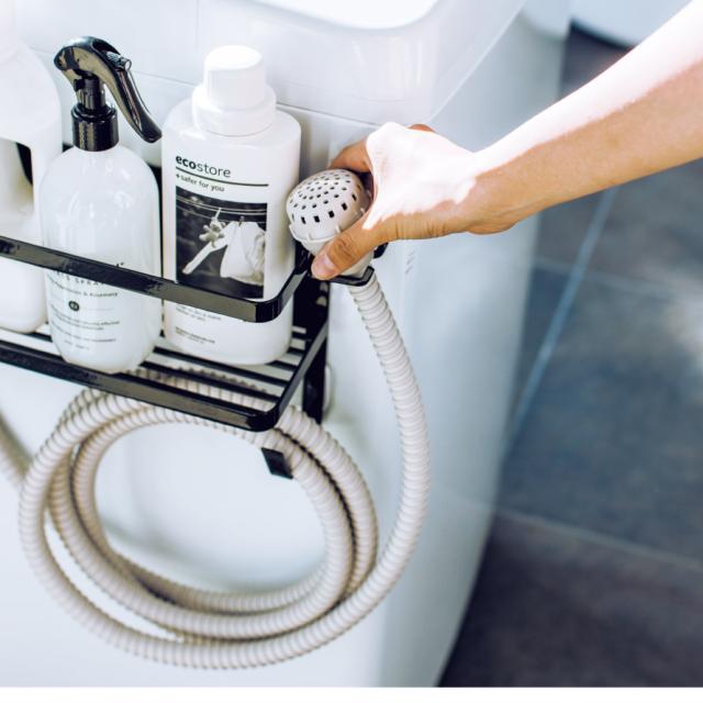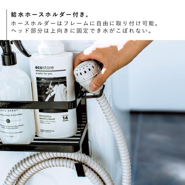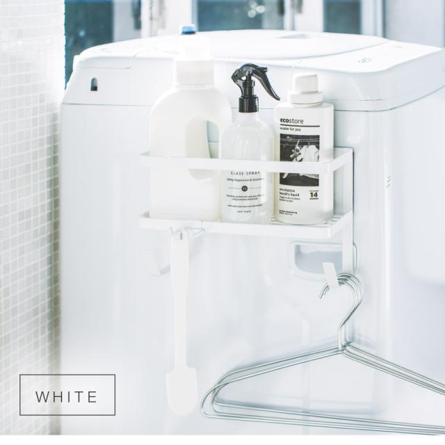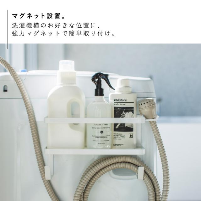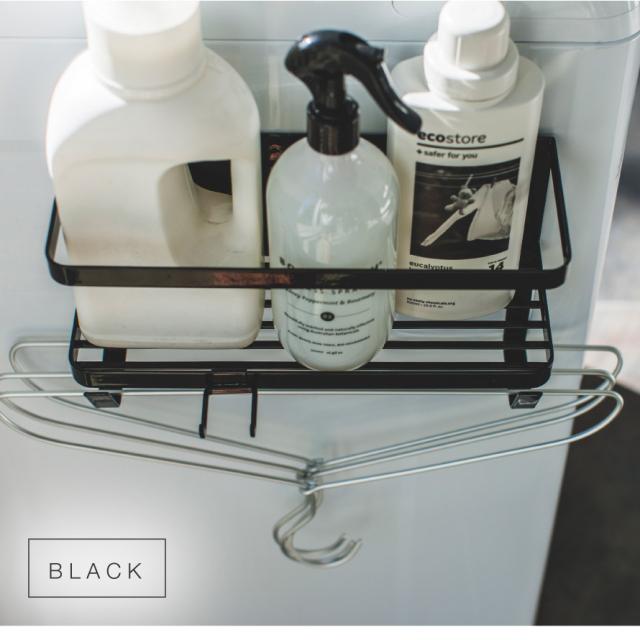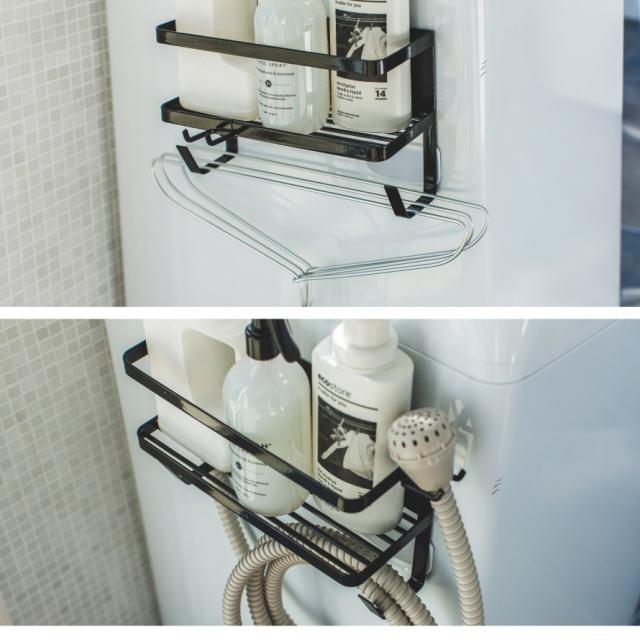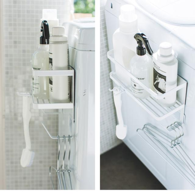 置き場所に困る給水ホースや洗濯用洗剤、ハンガーなどの小物も一括収納。洗濯機の周りがすっきり整頓できるマグネットラック。強力マグネットで簡単に取り付けることができ、工具も必要ありません。取り外しも簡単で、丸洗いすることができるので清潔に保てます。