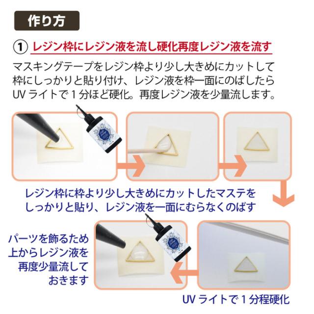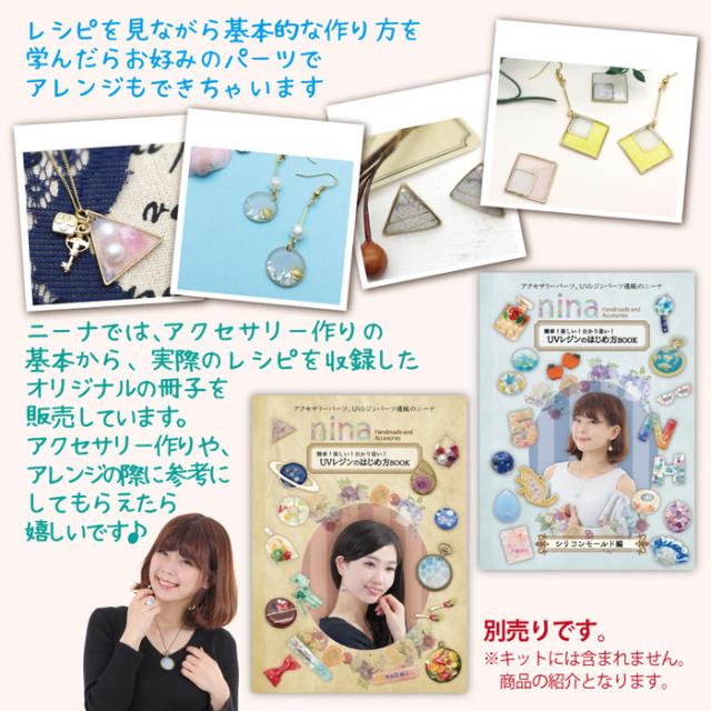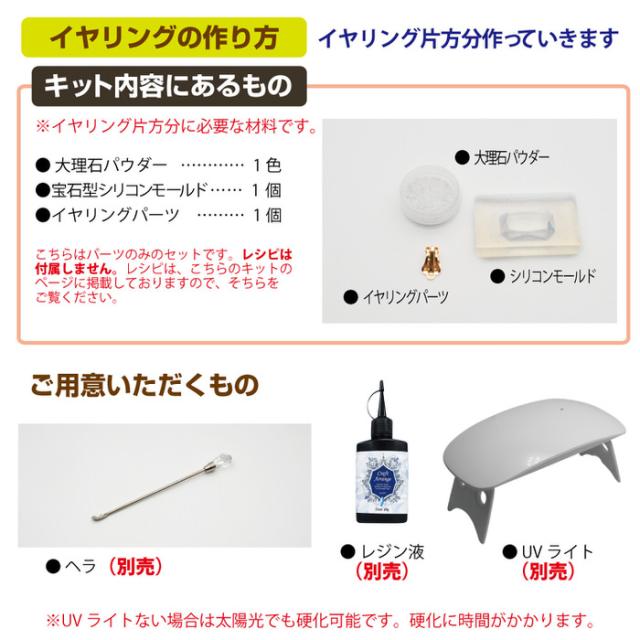 必要な材料がセットになっていますので、パーツを選ぶ手間がありませんので、すぐに作成を始められます。(レジン液は別売りとなりますので、別途ご用意ください。)