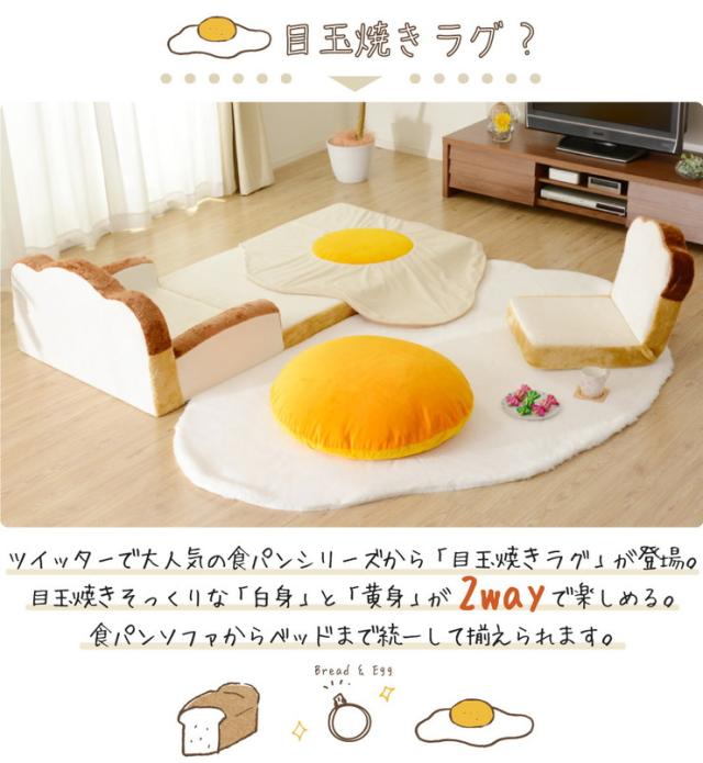 食パンシリーズのクッションにたまごの白身のかわいいラグマットが登場。