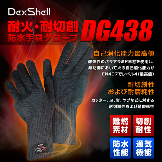 難燃性のパラアラミド素材(Kevlarタイプ)を使用したDG438グローブは熱防御において火の自己消化能力がEN407でレベル4(最高値)になります。 またアラミド素材が持つ切創耐性能力はEN388でレベル5と高い数値を出してます。 難燃素材・切創耐性・防水性能・通気性を備えたコンビネーショングローブは弱酸、化学薬品、危険な液体からも手を保護する、まさにマルチプロテクトグローブとして活躍します。