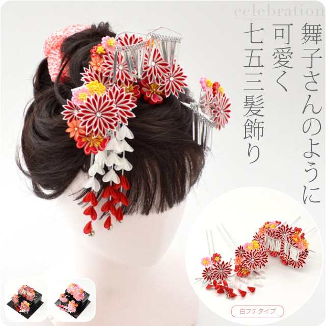 七五三 髪飾り 7歳 通年用 日本製 勝山 かんざし 3点セット 白縁取りタイプ つまみ細工 花簪 礼装 子供 女の子 女児10012232