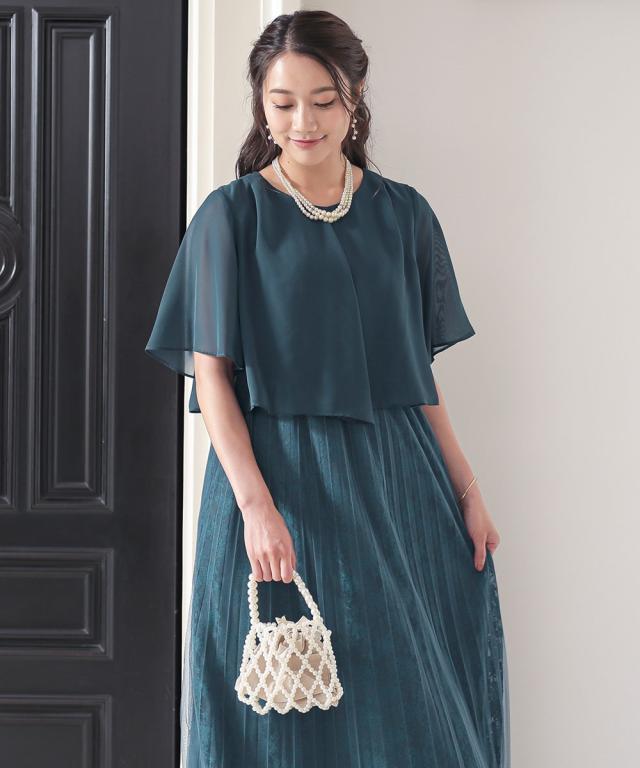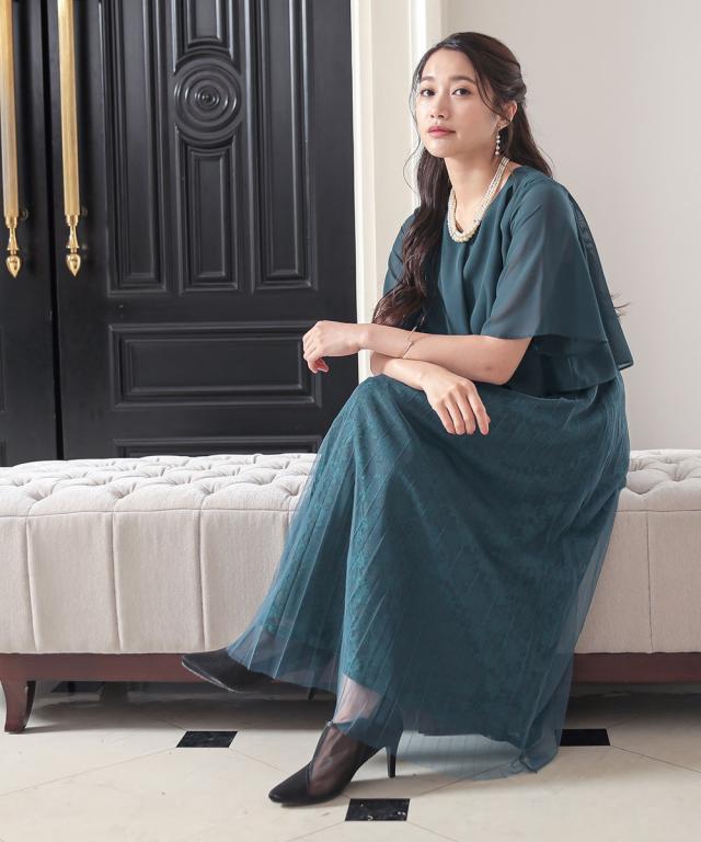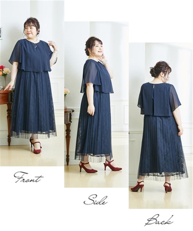 チュールプリーツ使いレースワンピースドレス【結婚式・二次会・お呼ばれ対応】<大きいサイズ>