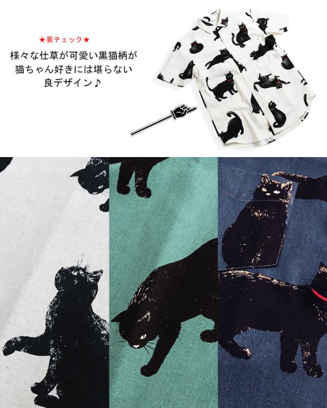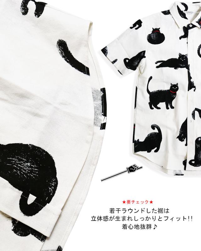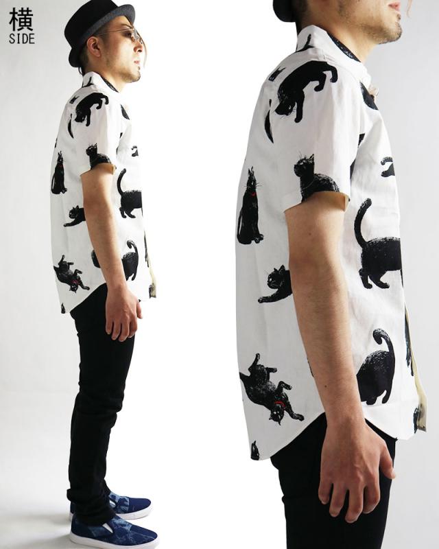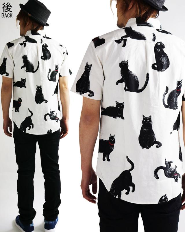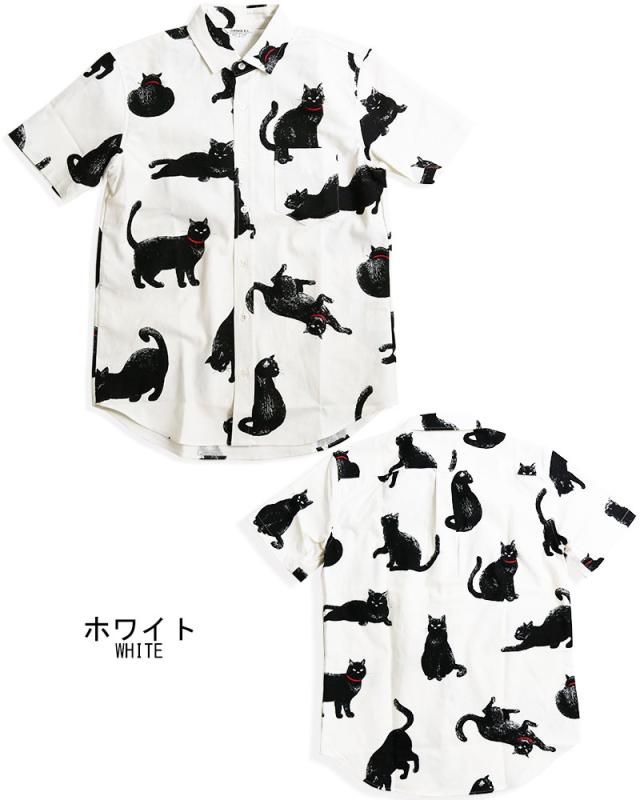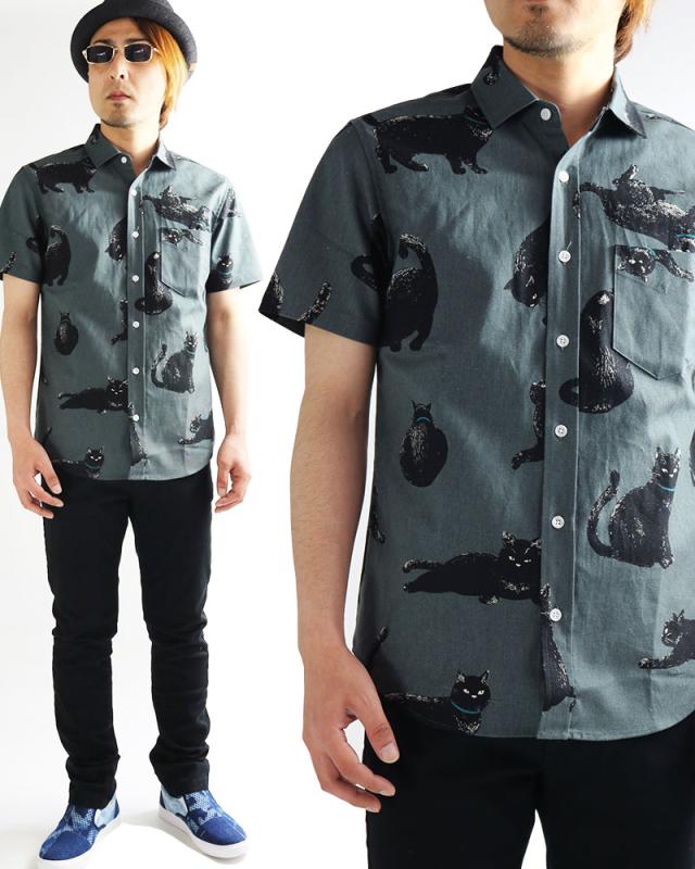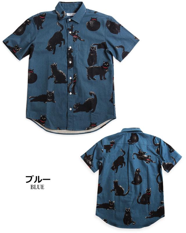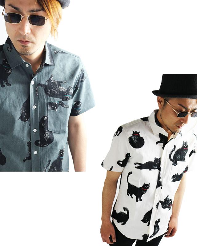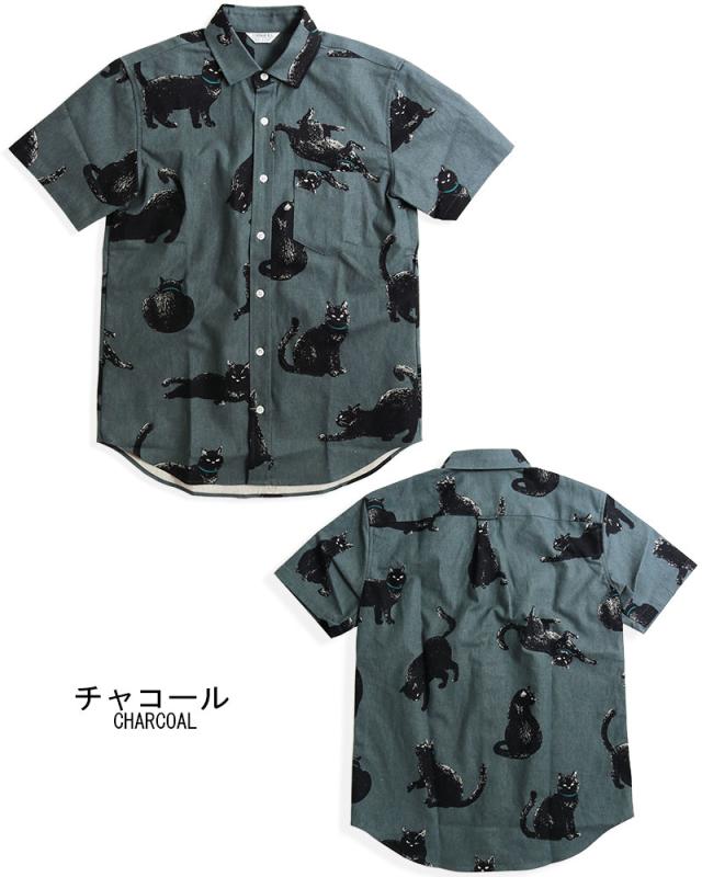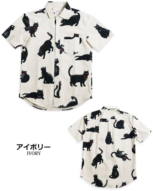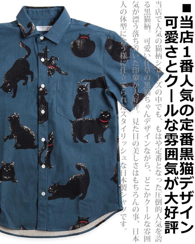 黒ネコ柄 半袖シャツ メンズ 黒猫 猫柄 派手柄 猫 CAT ねこ 柄シャツ カジュアル 日本製