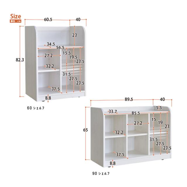 シェルフ:W60.5 x D40 x H82.3cm、W89.5 x D40 x H65cm