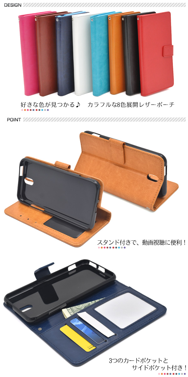 カラフルな8色展開のカラーレザースタンドケースポーチ。衝撃やキズなどからAndroid One S1を守ります。また、内部はソフトケースなので着脱が簡単です。背面を折り返すとスタンドとして使用できるので、動画視聴に便利です。落下防止に最適なストラップとストラップホール付きです。横開きタイプなので、手帳のように使うことができます。 また、内側に3つのカードポケットとサイドポケットが付いています。 ※Android One S1は付属しません。※ライセンス商品ではありません ※カードは付属しません。