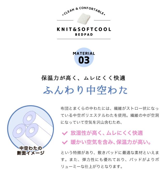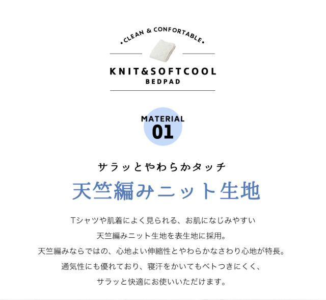 お肌になじみやすく、サラッとやわらかな肌ざわりが心地よい天竺編みニット生地の敷きパッド。