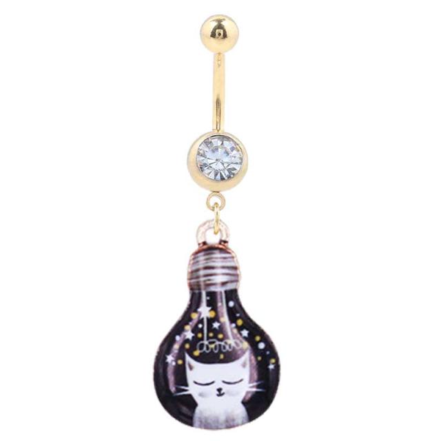 [14G 臍ピアス ボディピアス] 電球チャームへそピアス(グッドナイト) 14ゲージ 14G ヘソピアス メンズ レディース ボディーピアス サージカルステンレス316L クリスタル ゴールド 金メッキ 揺れる 猫 ねこ アニマル 動物 船 白猫 白ネコ ソケット 面白い 電気 星 夜 スター