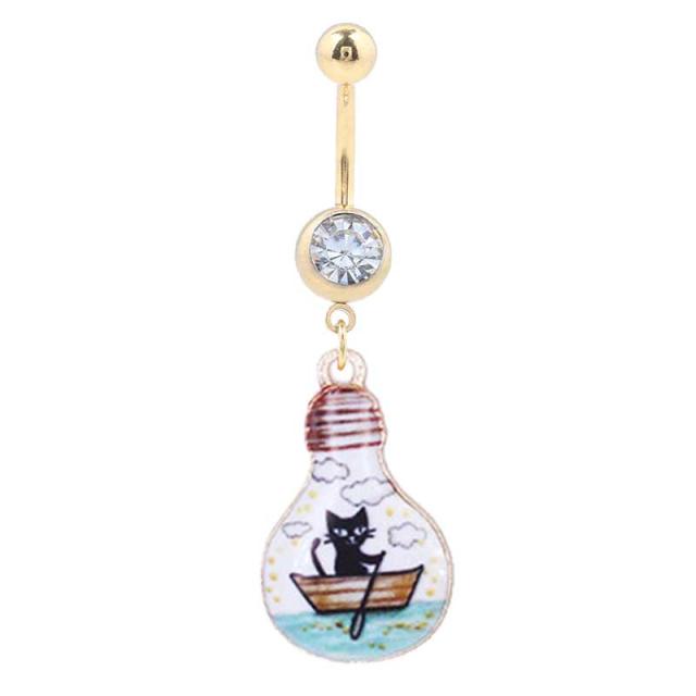 サージカルステンレス316L製のへそピアスを金メッキしたゴールドカラーのカーブバーベルに電球をモチーフにしたチャームをセットし中に船に乗る黒猫をデザインした可愛い臍ピアス。