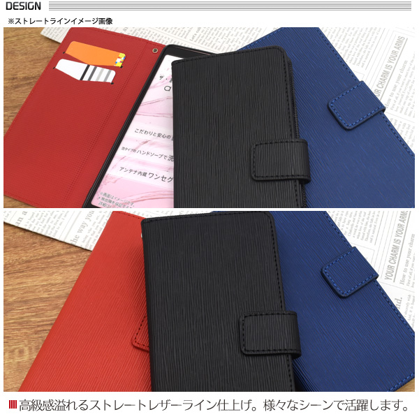 | 高級感あふれるストレートレザーデザインの手帳型ケース。 衝撃やキズなどからスマホを守ります。 また、内部はソフトケースなので着脱が簡単です。 背面を折り返すとスタンドとして使用できるので、動画視聴に便利です。 落下防止に便利なストラップとストラップホール付きです。 横開きタイプなので、手帳のように使うことができます。 また、内側に2つのカードポケットが付いています。 ※スマートフォンは付属しません。 ※ライセンス商品ではありません ※カードは付属しません。 | ||||||||||||||