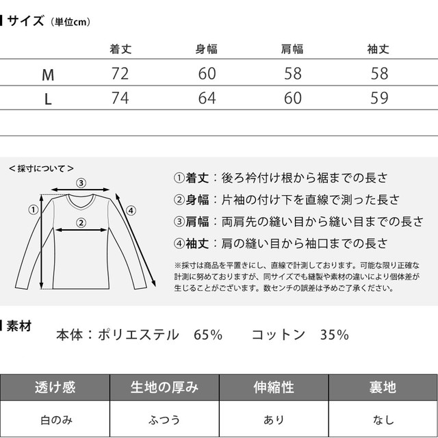 | サイズ | 着丈 | 身幅 | 肩幅 | 袖丈 |