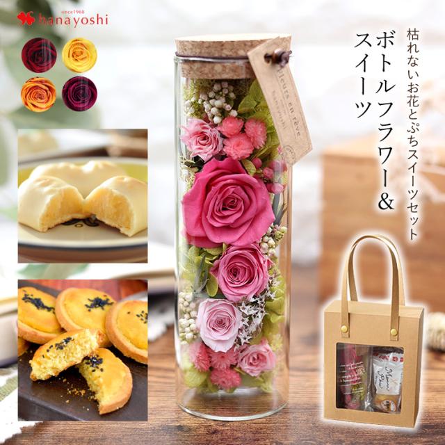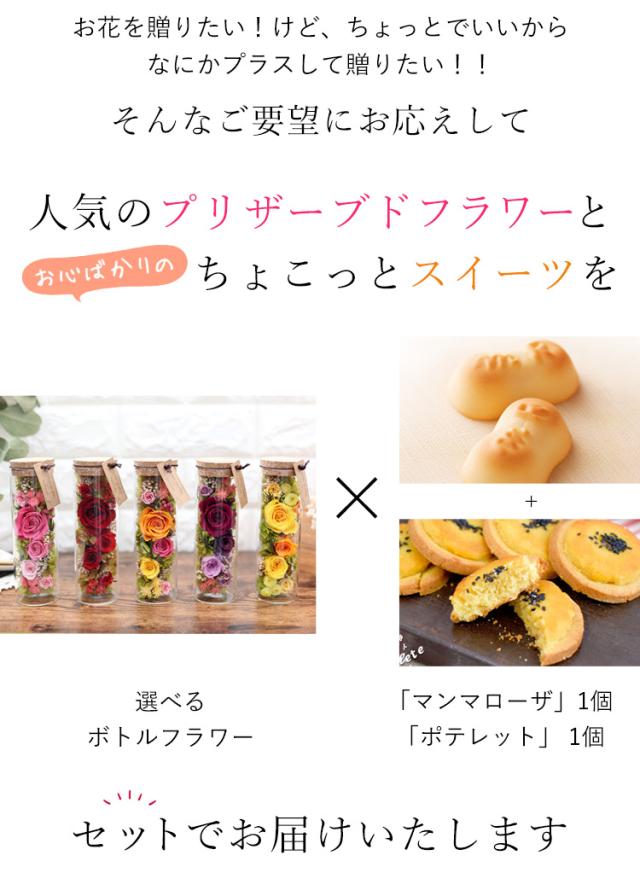 花とスイーツ 送料無料 ボトルフラワー 選べる5色 プリザーブドフラワーとぷちスイーツセット マンマローザ ポテレット 個包装 スイーツ お祝い 花 ギフト 花とセット ギフトセット お菓子 誕生日 プレゼント 女性 母 義母 友達 祖父 祖母 お歳暮 冬ギフト クリスマス
