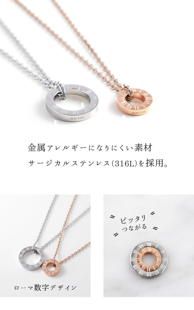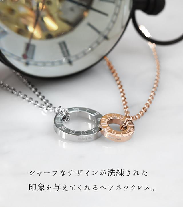 ペアネックレス 2本セット 金属アレルギー ステンレス サージカルステンレス 刻印 クリスマス プレゼント 贈り物 ギフト ローマ数字 合わせデザイン 重なる シンプル おしゃれ リング型 ペンダント 316L スティールシルバーカラー ローズゴールドカラー lstn019pair