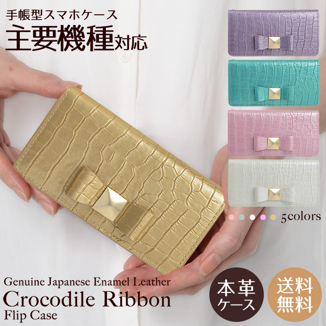 クロコダイル模様が型押しされたエナメルレザーと、派手すぎず地味すぎないラメのバランスが絶妙!可愛らしいリボンをあしらった手帳型ケースです。左利き用(右開き)もご用意しました。