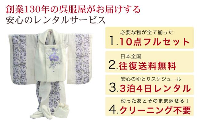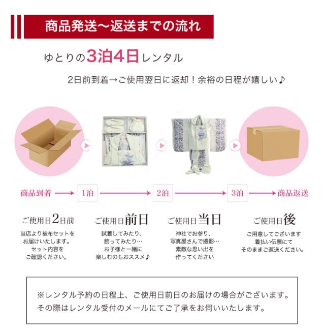 | 着物・被布コート・重ね衿・長襦袢・髪飾り・巾着・草履(18cm)・腰紐2本・足袋 | |||