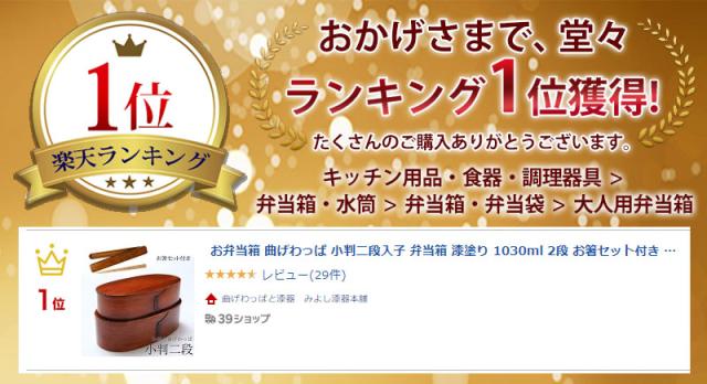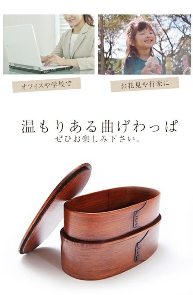 | 漆を何度も摺りこんで仕上げ、使い込むほどに風格を増していく逸品です。 杉の木が保湿をしますので、ごはんが冷めてもかたくなりにくく美味しく頂けます。 末永くお使いください。 食事後、収納時には上段をひっくり返すと下段にスッキリ収まり、コンパクトになります。 杉の木の調湿作用でごはんが冷めても美味しく頂けます。 ご飯がかたくなりにくく、レンジで温めなくても美味しいお弁当が味わえるのが、曲げわっぱの最大の魅力です。 荷物が多くなっても、若干でも負担が軽減されると思います。 通勤・通学や、普段の持ち歩きにも優しいですね。 |