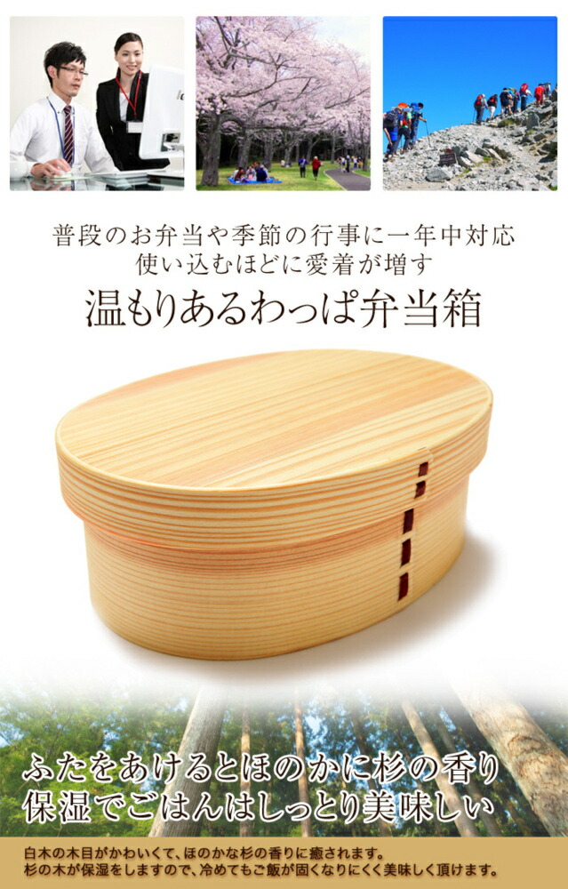 | 白木の木目がかわいくて、杉の香りがほのかに漂い、とてもリラクゼーションさせてくれます。 杉の木が保湿をしますので、ごはんが冷めてもかたくなりにくく美味しく頂けます。 末永くお使いください。 杉の木の調湿作用でごはんが冷めても美味しく頂けます。 ご飯がかたくなりにくく、レンジで温めなくても美味しいお弁当が味わえるのが、曲げわっぱの最大の魅力です。 荷物が多くなっても、若干でも負担が軽減されると思います。 通勤・通学や、普段の持ち歩きにも優しいですね。 |