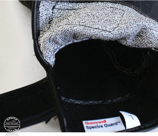 アラミドや通常のスペクトラ生地に比べて2−3倍の耐切創強度があります。