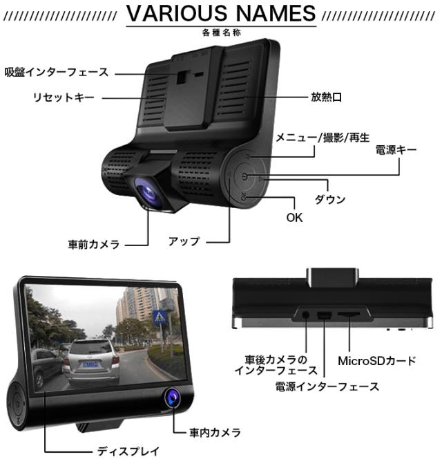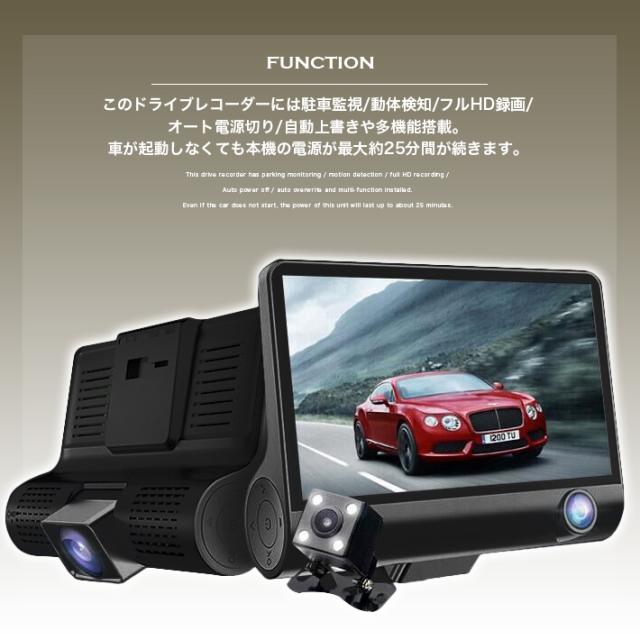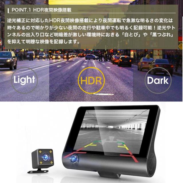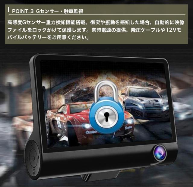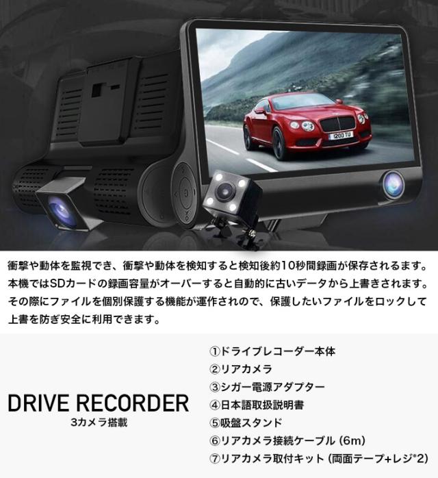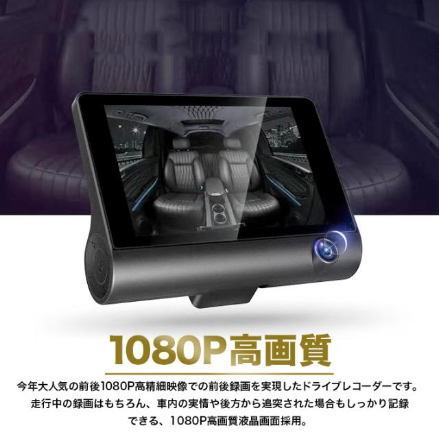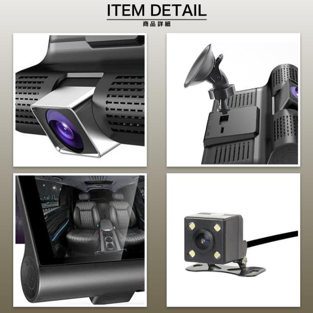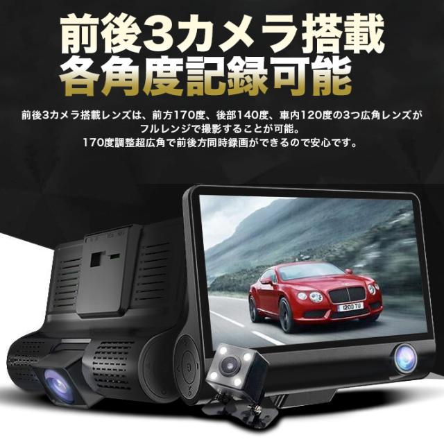 ドライブレコーダー 前後カメラ 【2019最新版 3カメラ搭載】 車載カメラ 車内外同時録画 リアカメラ付き 4.0インチ画面 1080PフルHD 170度広視野角 G-sensor WDR搭載 駐車監視 常時録画 日本語説明書