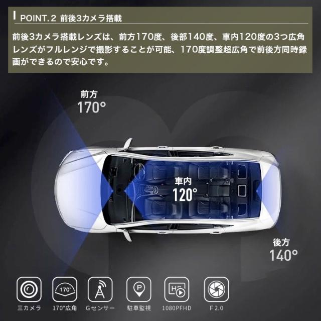 【前後3カメラ搭載 各角度記録可能】前後3カメラ搭載レンズは、前方170度、後部140度、車内120度の3つ広角レンズがフルレンジで撮影することが可能、170度調整超広角で前後方同時録画ができるので安心です。