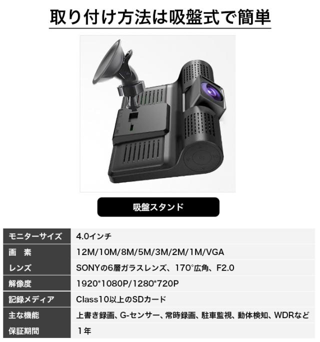 4.0インチ画面 1080PフルHD 170度広視野角 G-sensor