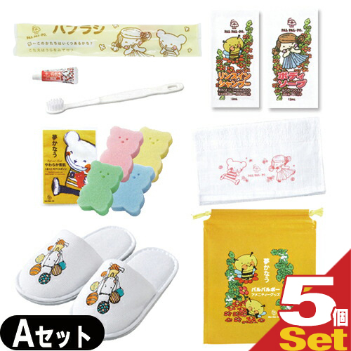【ホテルアメニティ】業務用 パルパルポー(PAL PAL・PO) 子供用 アメニティセットA x 5個セット (歯ブラシ・スポンジ(色選択不可)・ボディーソープ・リンスインシャンプー・タオル・スリッパ・バッグ)