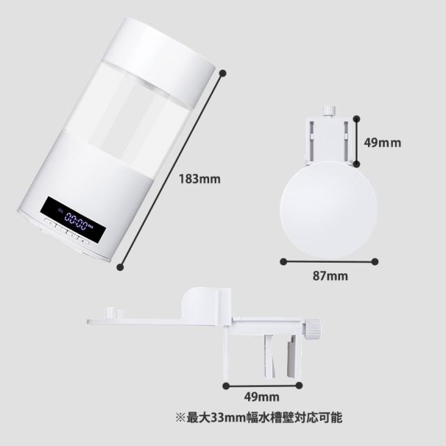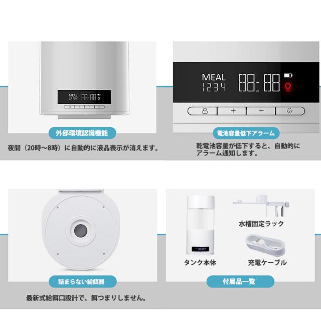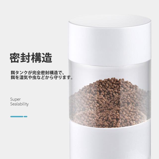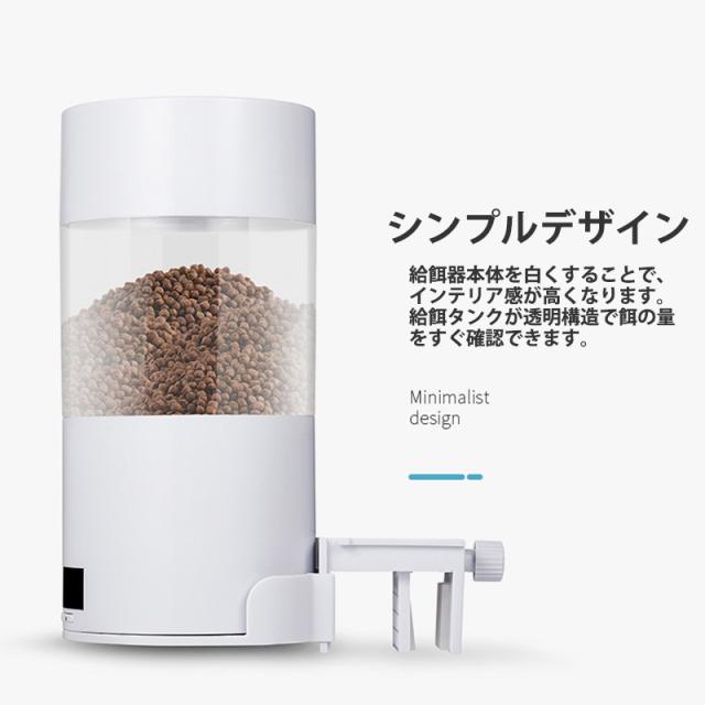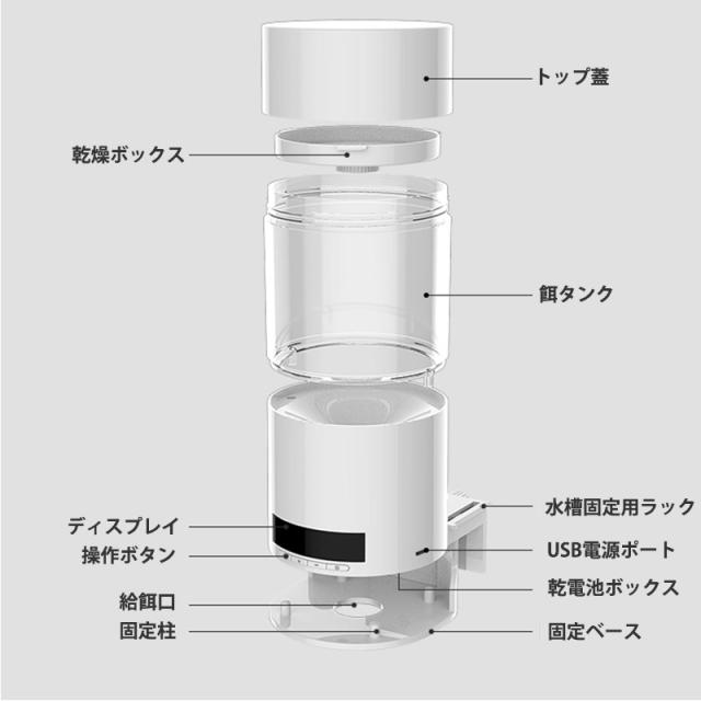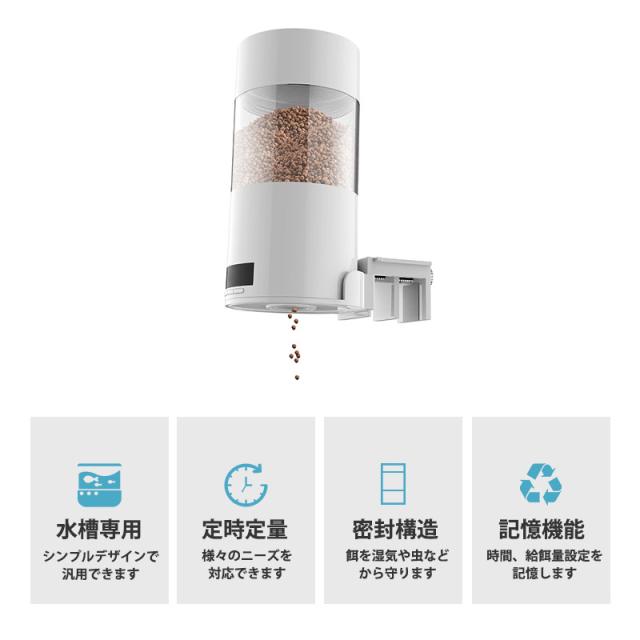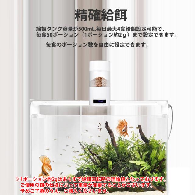 ■商品詳細・製品名:水槽用自動給餌器・本体サイズ:87×87×183mm※少し誤差が生じることがございます。・USB給電規格:DC5V/1A 充電ケーブル付属・乾電池給電:単4アルカリ乾電池×4 ※付属しておりません、別途ご購入していただく必要がございます。・本体重量:560g・給餌タンク容量:500ml・1回給餌可能量:100g(50ポーション、1ポーション2g)・1日4回給餌設定可能・付属品:給餌器本体、水槽セット用ラック、充電ケーブル【ご注意】当製品は直径4mm未満の丸い魚の餌に適しています。