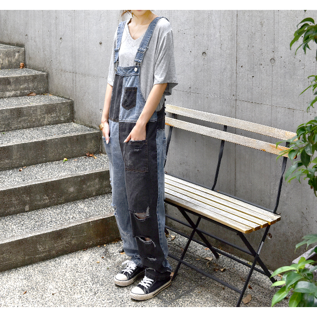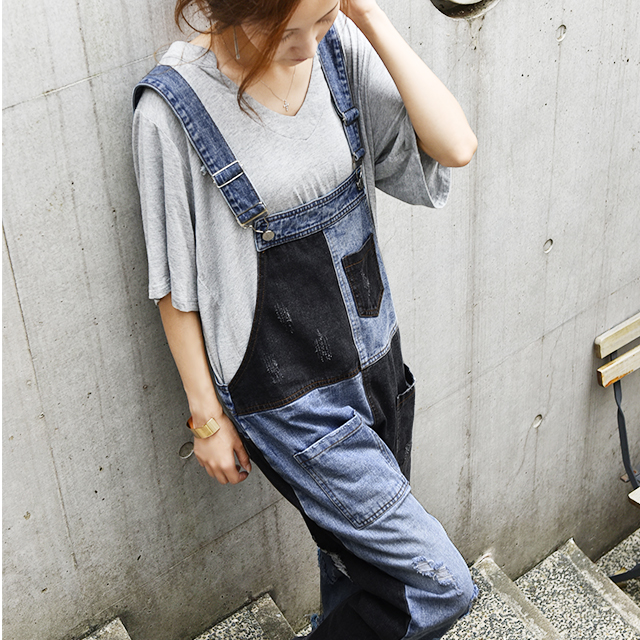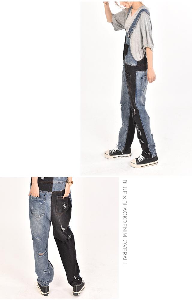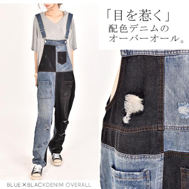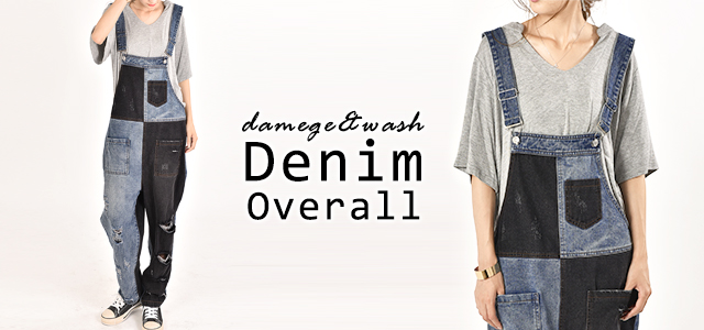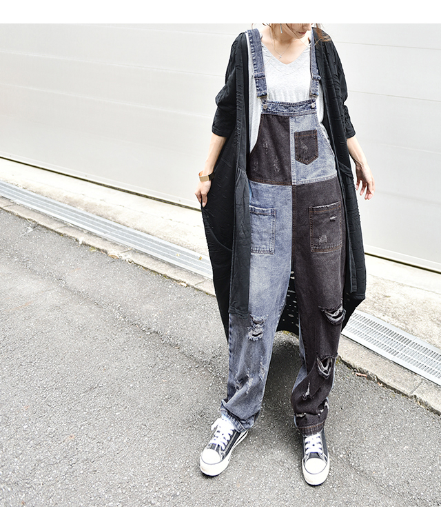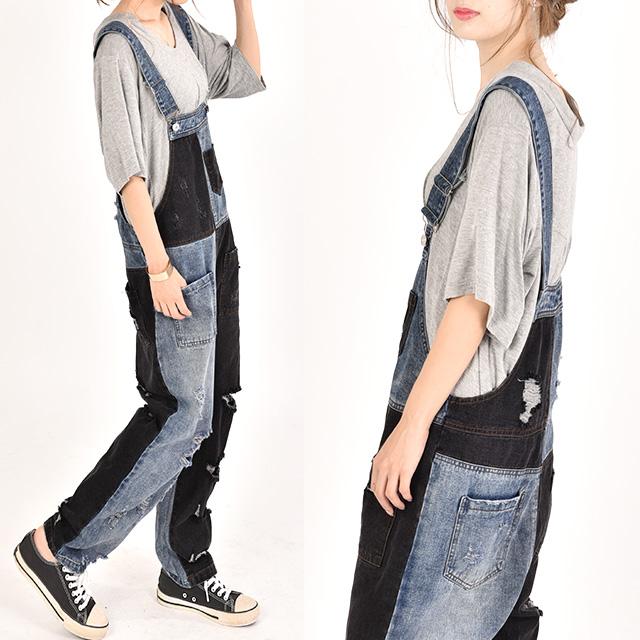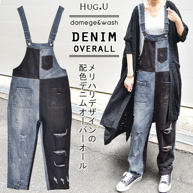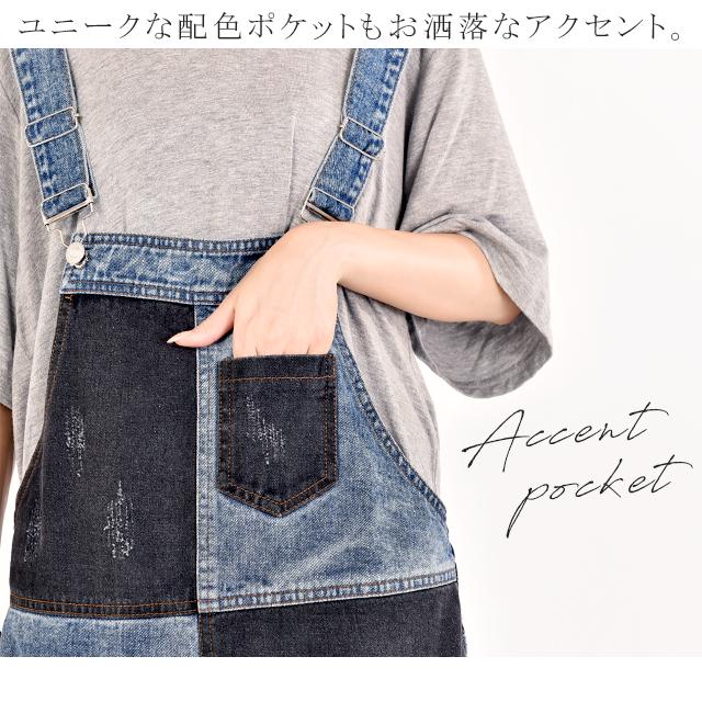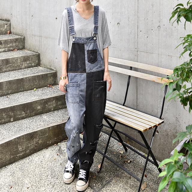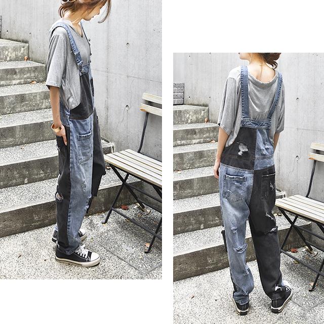 カジュアルな印象が漂う配色デニムのオールインワン。