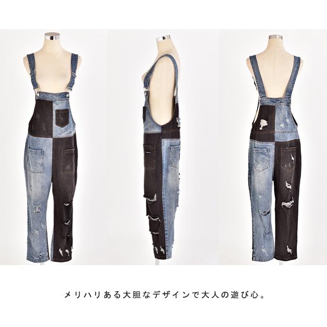 オールインワン デニム レディース サロペット ダメージ加工 デニムオールインワン 大きいサイズ つなぎ ワイドパンツ ワイド オーバーオール デニム パンツ ボトムス ロング ジーンズ 体型カバー チェック 配色 冬 秋 秋新作
