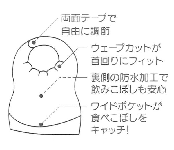 食べこぼしをキャッチするワイドポケット付きで、お洋服や床が汚れるのを防ぎます。裏側は防水加工されているので飲みこぼしも安心です。
