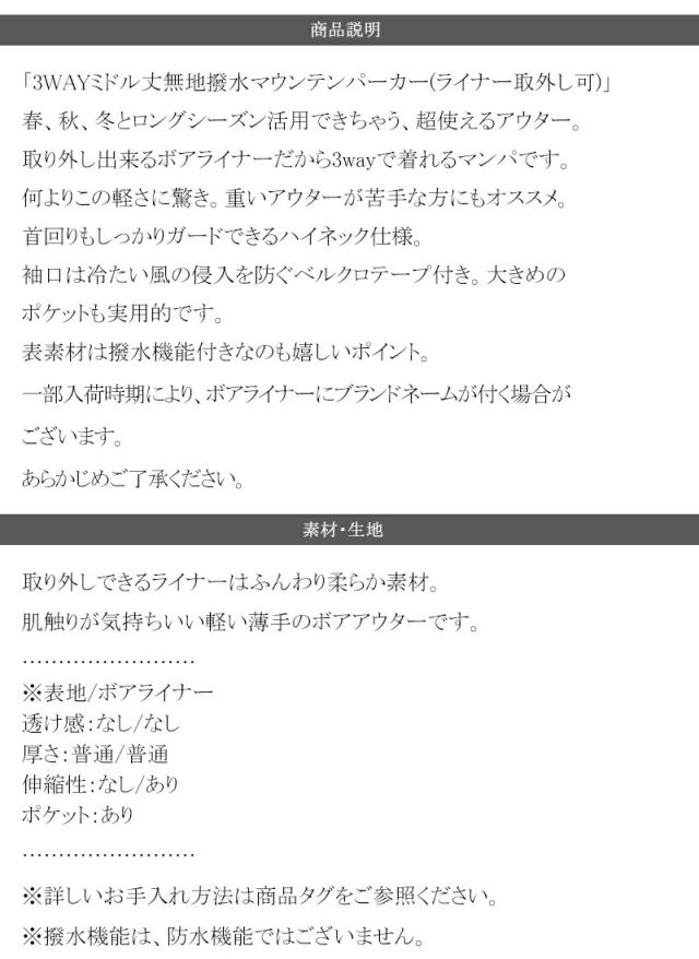 ![]() ![]() ![]() ![]() ![]() ![]() ![]() ![]() ![]() ![]() ![]() ![]() ![]() ![]() ![]() ![]() ![]() ![]() ![]() ★3WAYミドル丈無地撥水マウンテンパーカー(ライナー取外し可)★ ロングシーズン活用できちゃう、超超超使える!!アイテム。 何よりこの軽さに驚き。重いアウターが苦手な方にもおすすめです。 嬉しい撥水機能付き。 取り外しできるライナーだから3wayで着れちゃうマンパです。 おしゃれさと機能性にこだわったアウターは、 フードがついて首回りもしっかりガードできるハイネック仕様。 選びやすいアースカラーのカラー5色展開。 大きいサイズを選んでビッグシルエットで モッズコートのような着こなしやオーバーシャツにも合わせられるのも◎ ユニセックス(男女兼用)タイプでサイズもXLまでと豊富なので メンズでもレディースでも着れちゃいます。 ※入荷時期によりライナーの仕様が異なる場合がございますが、 機能に変わりはございません。 レビュー商品の評価: