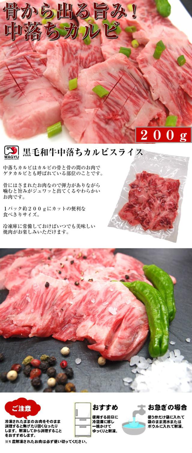 中落ちカルビはカルビの骨と骨の間のお肉でゲタカルビとも呼ばれている部位のことです。骨に挟まれたお肉なので弾力がありながら噛むと旨味がジュワッと出てくる柔らかいお肉です。1パック約200gカットの便利な食べきりサイズ。冷凍庫に常備しておけばいつでも美味しい焼肉がお楽しみいただけます。