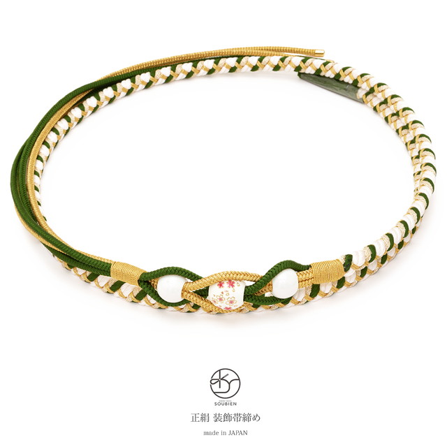 帯締め 振袖 成人式 振袖用 帯締め成人式 深緑 ダークグリーン 白 トンボ玉 フェイクパール 手ぐみひも 正絹 蜻蛉玉 和装小物 日本製 送料無料