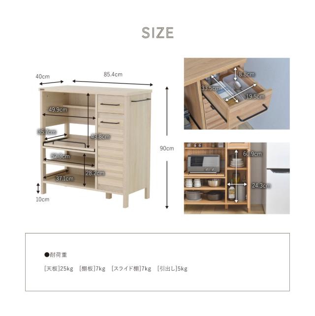 耐荷重:[天板]25kg[棚板]7kg[スライド棚]7kg[引出し]5kg
