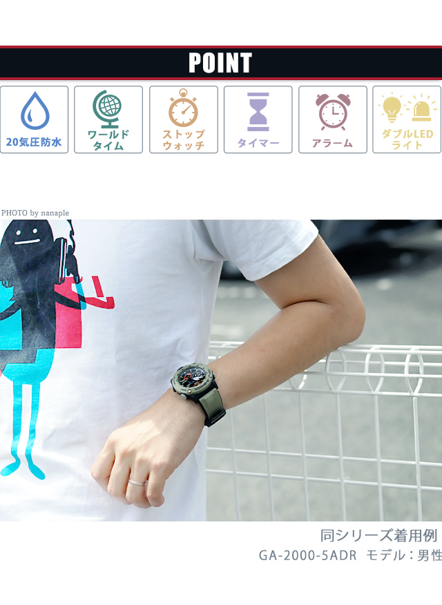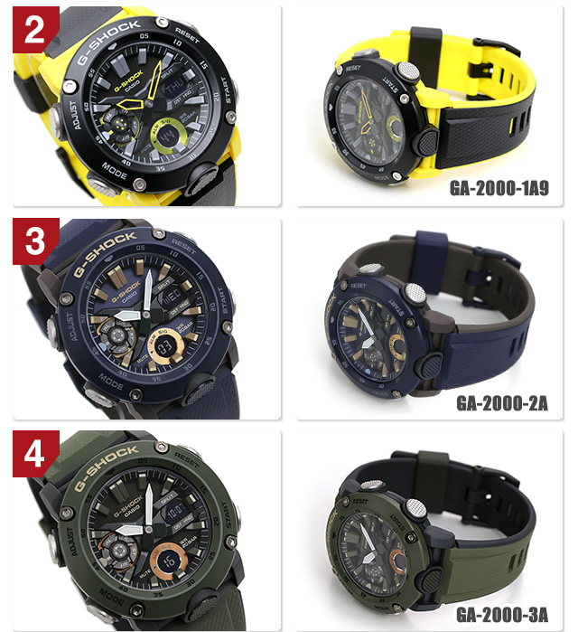 7年保証キャンペーン カシオ Gショック ベーシック GA-2000シリーズ クオーツ G-SHOCK-GA-2000 GA-2000 メンズ 腕時計 CASIO G-SHOCK BASIC 2000SERIES アナデジ 選べるモデル ◆耐衝撃構造として「カーボンコアガード構造」を採用したシリーズが登場。ケース素材に、軽量ながら樹脂の概念を越える高剛性を発揮するカーボン繊維入りファインレジンを使用。衝撃による破損、変形を防ぐことで、内部に配置したモジュールを保護します。更に、裏蓋を二重構造とすることで、裏面への衝撃もガード。ボタン構造の耐衝撃化により、ボタンガードのない外装デザインも同時に実現しました。デザイン面では、立体文字板や大型フロントボタンなどを大胆に配置。力強い表情を醸し出すタフネスデザインに仕上げましたまた、スライド式のバンドを採用し、簡単なワンタッチ操作でバンドの取り外しが可能。バンド交換によるカスタマイズ(別売り)にも対応しています。 国内品番:GA-2000-1A2JF GA-2000-1A9JF GA-2000-2AJF GA-2000-3AJF GA-2000-5AJF GA-2000S-1AJF GA-2000S-7AJF 海外品番:GA-2000-1A2 GA-2000-1A9 GA-2000-2A GA-2000-3A GA-2000-5A GA-2000S-1A GA-2000S-7A