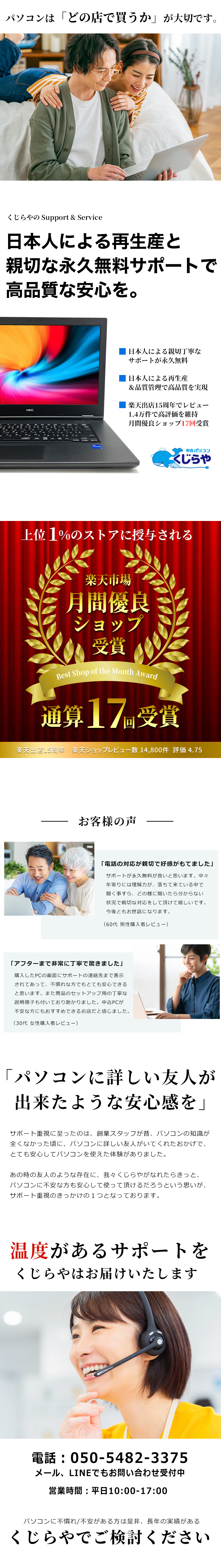お客様にパソコンを安心して使い続けて頂く為に、くじらやはこの2点を重視してきました。この結果、運営店舗の1つ楽天市場店では、 ショップレビュー数は15,000件以上、評価は4.75と高評価を頂き、楽天市場公認の優良店の証「月間優良ショップ」を17回受賞の唯一のお店となりました。