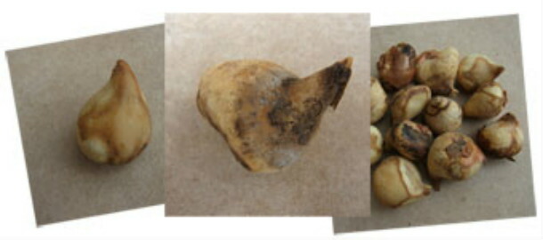 | 【ポイント2】 チューリップの皮は実はなくてもいいんです。 【ポイント3】 これがホントの不良球。まず、発芽もしません。当然、花も咲きません。 |