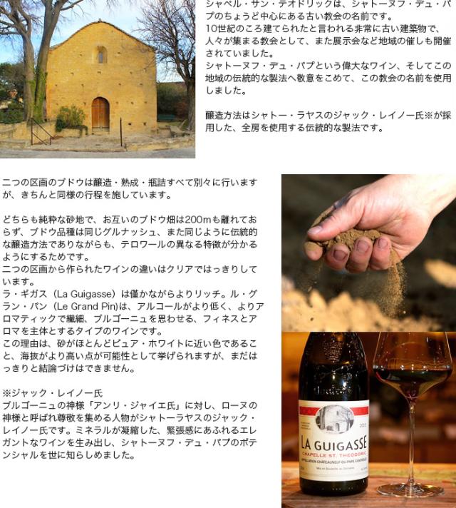 | 生産量は年間わずか3000本。 ”ギガス”はシャトーヌフ・デュ・パプの東側に位置し、シャペル・サン・テオドリックのもう一つの所有畑 ’ル・グラン・パン’から約200メートルほどの距離に位置し、土壌は主に粘土と砂で形成されています。ブドウはすべてエコセール認証のオーガニック。収穫量はかなり低く、1ヘクタールあたり15ヘクトリットル。 10月に入ってから収穫した遅摘みブドウを使用し、伝統的な全房を使用する醸造方法。自生酵母で発酵を行い、様々な年代のデュミ・ミュイと呼ばれる樽(Demi-Muid:600?700リットル)で24か月熟成します。 | 生産量は年間わずか3000本。 畑はシャトーヌフ・デュ・パプ生産地域の東側に位置し、ラヤス(Rayas)の真隣り。原産地呼称シャトーヌフ・デュ・パプのもっとも優れた区域の一つ、ピニャン(Pignan)という区画(Liu-dit)で、とても細かい砂質土壌です。大振りの石ころに覆われていることが特徴と言われるシャトーヌフ・デュ・パプの畑にあって、シャトーラヤス同様に石のない綺麗な畑です。ブドウはすべてエコセール認証のオーガニック。収穫量はかなり低く、1ヘクタールあたり15ヘクトリットル。 10月に入ってから収穫した遅摘みブドウを使用し、伝統的な全房を使用する醸造方法。自生酵母で発酵を行い、様々な年代のデュミ・ミュイと呼ばれる樽(Demi-Muid:600?700リットル)で24か月熟成します。 | |||