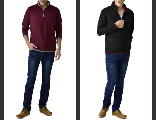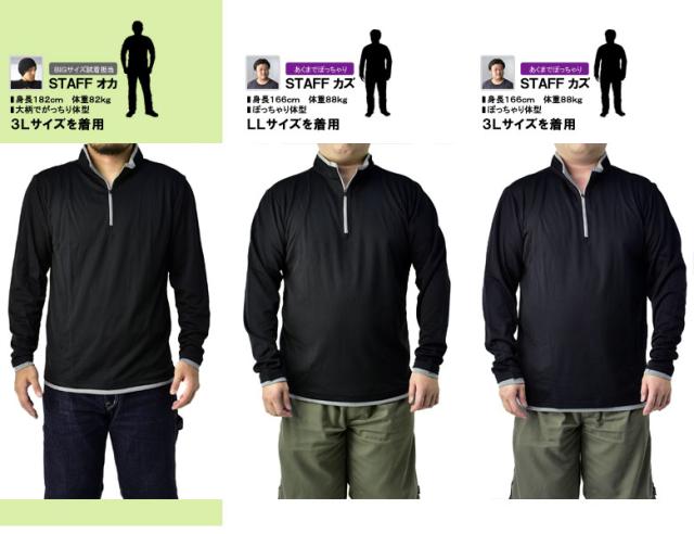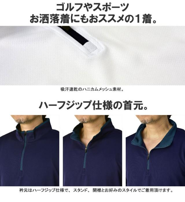 ハーフジップ仕様で、スタンドでハイネック風、開けるとポロシャツと襟元が変化し、 お好みの襟スタイルでご着用頂けます。