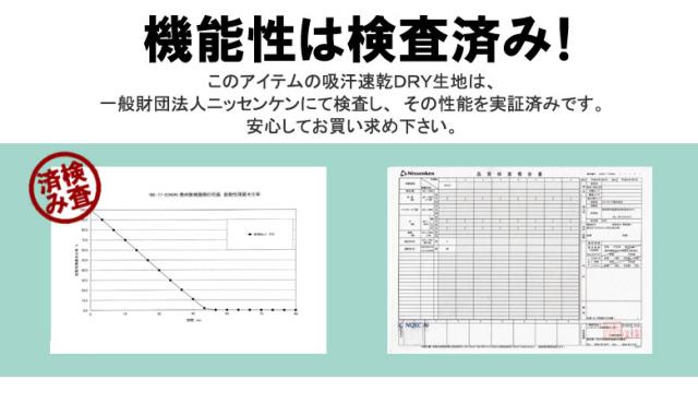 ●本製品の吸汗速乾DRY生地は、一般財団法人ニッセンケンにて検査し、 その性能を実証済みです。安心してお買い求め下さい。