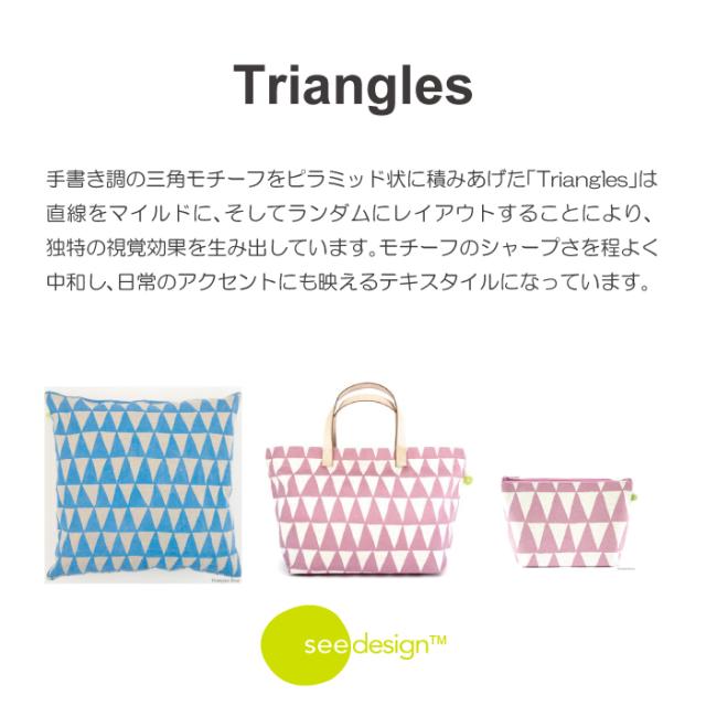 手書き調の三角モチーフをピラミッド状に積みあげた「Triangles」は直線をマイルドに、そしてランダムにレイアウトすることにより、独特の視覚効果を生み出しています。モチーフのシャープさを程よく中和し、日常のアクセントにも映えるテキスタイルになっています。