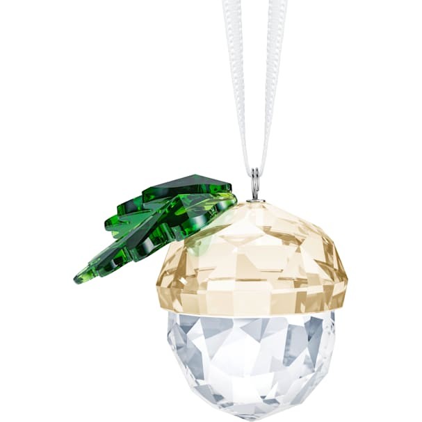 スワロフスキー 『どんぐり オーナメント』です。クリスマスシーズンのご自宅に冬の森の美しさをもたらすドングリのオーナメント。受賞歴のあるデザイナーのトード・ボーンチェによるデザインで、クリア、ゴールド、グリーンのクリスタルに約172面のきらめくファセットを施し、美しく仕上げています。装飾品であり玩具ではありません。15歳未満のお子様によるご使用は対象としておりません。
