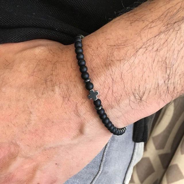 天然石風の黒いマットなストーンに黒い艶やかなヘマタイトのような石を十字架型にデザインしたブレスレット。