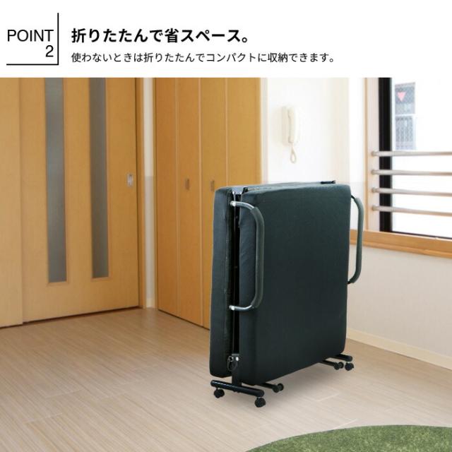 | 体圧分散に優れた低反発ウレタンマットを使用した折りたたみベッド。 お好みの角度に調節できる5段階リクライニング機能付き。 キャスター付きで移動も楽々。 |