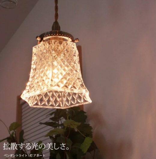 上品なクラシック感漂うガラスのペンダントライト。ガラスのカッティングにより、透過した光が美しく壁や天井に反射します。