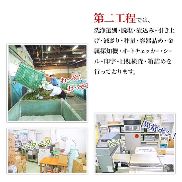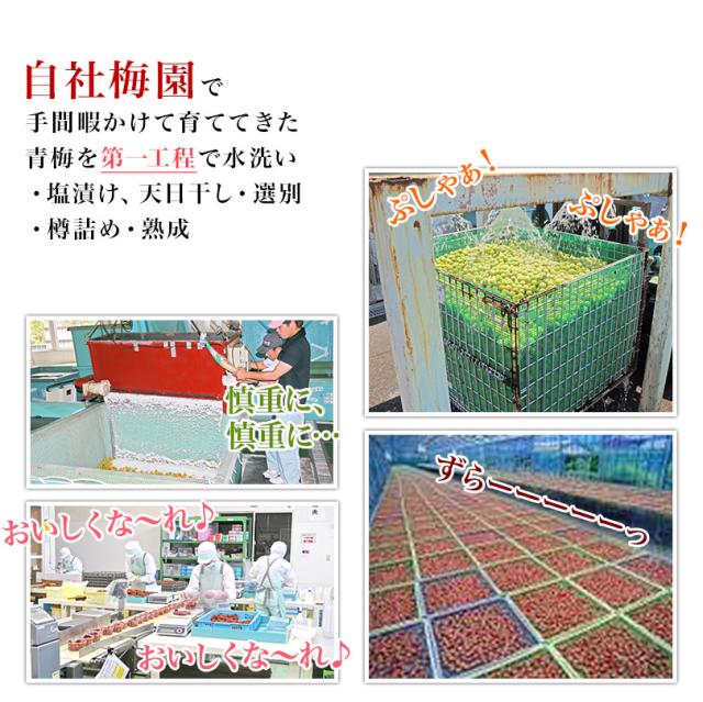 | *うす塩*梅、漬け原材料〔食塩、還元水飴、砂糖、発酵調味料〕、調味料(アミノ酸等)、酸味料、ユッカ抽出物、 ビタミンB1(原材料の一部に大豆を含む)*しそ漬*梅、漬け原材料〔食塩、しそ〕*はちみつ*梅、漬け原材料〔食塩、果糖ブドウ糖液糖、発酵調味料、はちみつ調味料(アミノ酸等)、酸味料、ユッカ抽出物、 ビタミンB1、甘味料(ステビア)(原材料の一部に小麦を含む)*こんぶ*梅、漬け原材料〔食塩、砂糖、還元水飴、発酵調味料、こんぶ〕、調味料(アミノ酸等)、酸味料、ユッカ抽出物、 ビタミンB1、(原材料の一部に大豆を含む) |